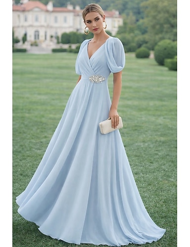 Linea ad A Abito Lunghezza al pavimento Abito da invitata a nozze Abito da sera Abito da cerimonia per signora Manica Corta Scollo a V Elegante Semplice Casual Formale Chiffon Scialli con Arricciato
