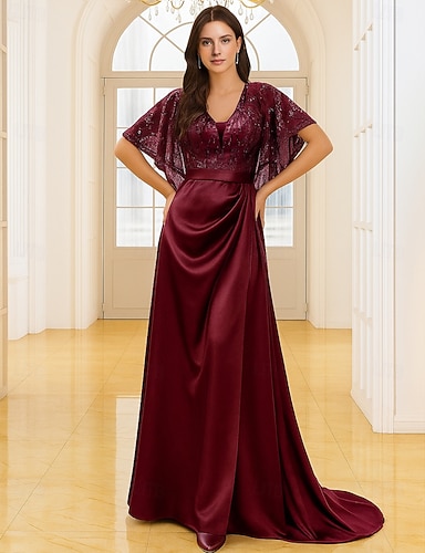 Abito da ospite di matrimonio a lunghezza terra A-Line Abiti formali Abito da sera Abito per la madre della sposa Maniche corte Collo a V Elegante Vintage Lusso con Paillettes
