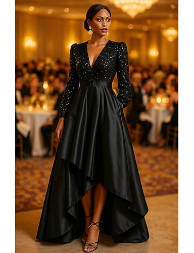Linea ad A Asimmetrico Abito da Sera Da principessa Elegante Brillanti Setoso Manica Lunga Scollo a V Matrimonio Formale Raso Con Paillettes con Glitter