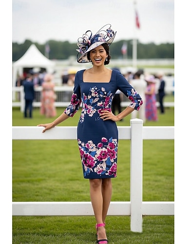 Tubino Colonna Lunghezza al ginocchio Abito da Cocktail Abito da invitata a nozze Abito Derby Abito da cerimonia per signora Manica 3/4 Collo quadrato Elegante Formale Derby del Kentucky Raso con