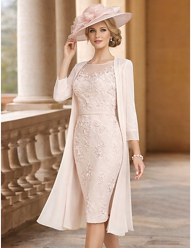 Due Pezzi Tubino Colonna Lunghezza al ginocchio Abito da invitata a nozze Abito da cerimonia per signora Manica 3/4 Scollo a Barca Elegante Vintage Taglie Forti Ospite di nozze Chiesa Chiffon Pizzo