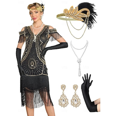 Set Anni Ruggenti Anni 1920 Mini Vestito Abito Flapper Abiti con accessori Senza maniche Il grande Gatsby Charleston Paillettes Frangia con nappe Piuma Scollo a V profondo Costume Per donna Carnevale