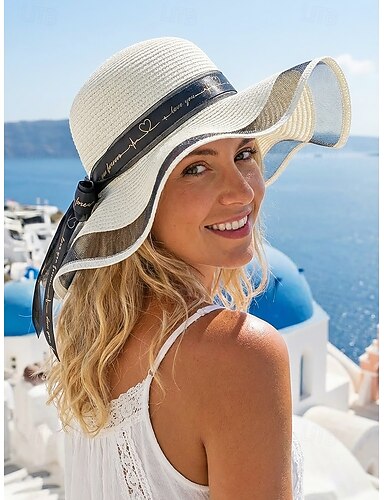 Cappello da sole bohémien da donna in paglia, cappello da spiaggia morbido, pieghevole, multicolore, con tesa larga, bordo ondulato e fiocco, ideale per vacanze, viaggi, stile resort e abbigliamento