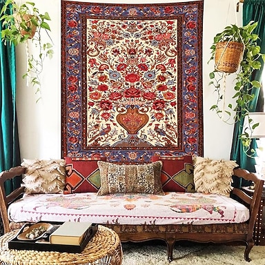 Arazzo da parete con vaso floreale in stile persiano vintage, rose rosse, uccelli, motivo tappeto orientale, arazzo da parete, arredamento boho chic per la casa, sfondo per soggiorno e camera da letto