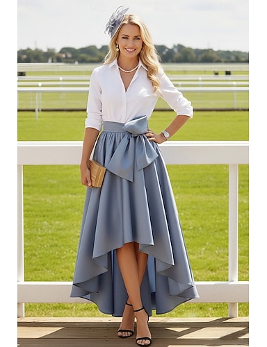 Linea ad A Set di Abiti Lunghezza Tè Abito da invitata a nozze Abito da cerimonia per signora Manica Lunga Manica 3/4 Colletto a Camicia Elegante Vintage Semplice Formale Ospite di nozze Raso con