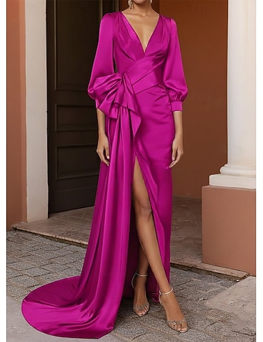 Sirena Tromba Strascico a Terra Lunghezza al pavimento Abito da Sera Elegante Stile Celebrità Manica Lunga Scollo a V Festa in giardino Matrimonio Raso con Pieghe Arricciato Spacco