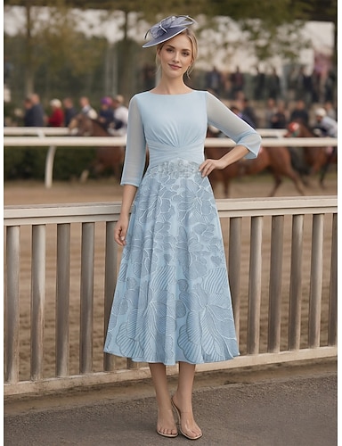 Linea ad A Abito Lunghezza Tè Abito da invitata a nozze Abito da cerimonia per signora Manica 3/4 Scollo a Barca Elegante Vintage Formale Ospite di nozze Derby del Kentucky Chiffon con Arricciato