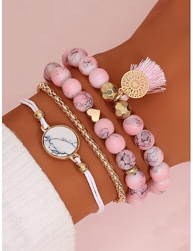 Set di braccialetti con perline di howlite da donna: stile boho a strati con ciondolo a forma di cuore, pendente in marmo e nappa per abbigliamento casual, outfit da spiaggia e regali