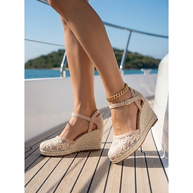 Eleganti sandali con zeppa espadrillas color albicocca da donna - décolleté traspiranti in rete con pizzo floreale e cinturino regolabile alla caviglia, ideali per crociere e viaggi in yacht di lusso.