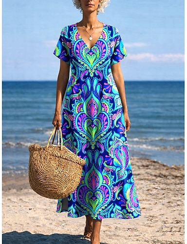 Per donna Abito Midi Vestito Estivo Abito a trapezio Vacanza Casual Boho A farfalla Spiaggia Vestibilità regolare Grafico Tribale Manica Corta Girocollo Blu Blu chiaro Oro nero Nero Estate Primavera