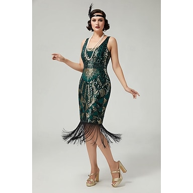 Anni Ruggenti Anni 1920 Lunghezza al ginocchio Abito Flapper Senza maniche Il grande Gatsby Paillettes Frange Scollo a V Costume Per donna Natale Carnevale speakeasy Mascherata Festa a tema retrò