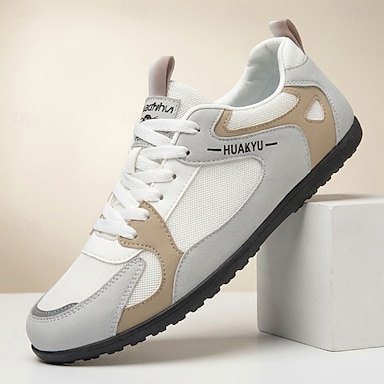Scarpe da ginnastica casual da uomo con lacci, in similpelle bianca e beige, ideali per camminare, viaggiare e per tutti i giorni.