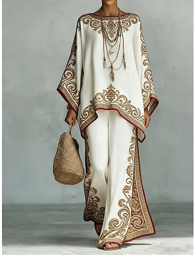 Per donna Camicia Set di biancheria in cotone Set di Pantaloni Manica Lunga Manica a Campana Girocollo Grafico Paisley Stampato Elegante Vacanza Moda Casuale Quotidiano All'aperto Rosso Cammello