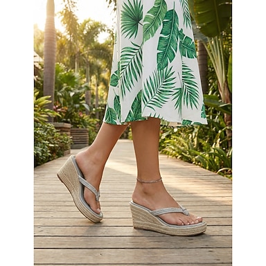 Eleganti sandali con zeppa da donna color grigio chiaro - cinturini infradito con strass scintillanti e plateau in espadrillas intrecciata, perfetti per resort all'aperto e feste in giardini
