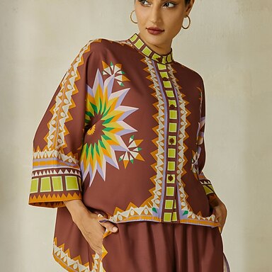 Camicia etnica in raso setoso con maniche a pipistrello e motivo totem.