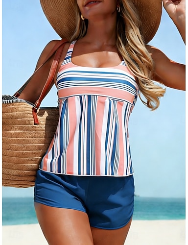 Per donna Costumi da bagno Tankini Due pezzi Vita alta Costume da bagno Controllo della Pancia Vita alta Snello Senza schiena Vacanza Abbigliamento da Spiaggia A righe Collo a U Senza Maniche Costumi