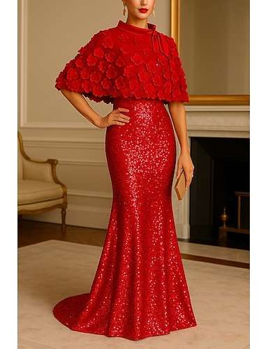 Sirena Tromba Lunghezza al pavimento Abito da Sera Elegante Scintillante Stile Celebrità Manica Corta Collo Alto Festa in giardino Matrimonio Crepe Elasticizzato con Glitter Perle Perline