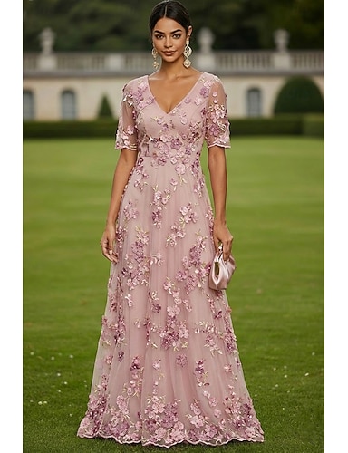 Linea ad A Lunghezza alla caviglia Abiti da Cocktail Abiti da festa Elegante Vintage Floreale Mezza Manica Scollo a V Matrimonio Formale Vestito Rosa Raso con Ricamo Tasca