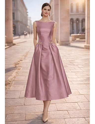Linea ad A Lunghezza Tè Abiti da Cocktail Elegante Senza Maniche Scollo a Barca Festa in giardino Matrimonio Raso con Arricciato Cristalli