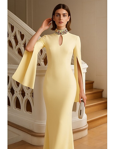 Tubino Colonna Lunghezza al pavimento Perline ricamate Abito Formale Abito da madre della sposa Abito da ballo con mantello Abito da Sera Abito formale Elegante Brillanti Senza Maniche Collo Alto