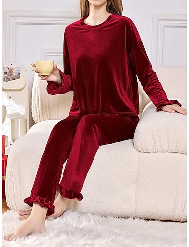 Per donna Pigiama Abbigliamento da Casa Caldo Moda Casual Colore Puro Arricciato Allacciato Patchwork Vacanza Casa Da letto Manica Lunga Scollo a V Blu Nero Vino Verde Inverno Vestibilità regolare