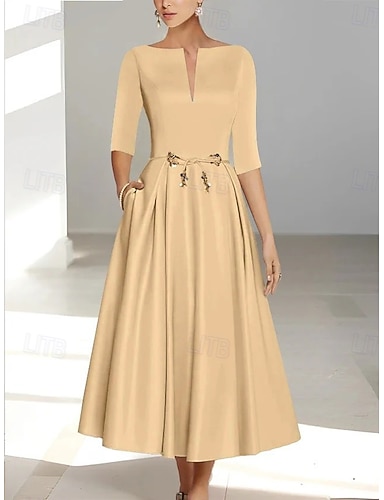 Linea ad A Lunghezza Tè Abiti da Cocktail Abiti da festa Elegante Minimalista Manica 3/4 Collo gioiello Ospite di nozze Abbigliamento da Festa Invitato a matrimonio autunnale Raso con Pieghe