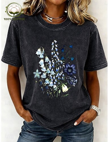 T-shirt da donna in 100% cotone vintage lavato top stampa grafica piante elegante basic classica a maniche corte girocollo girocollo regolare top casual quotidiani blu verde avocado nero rosa viola
