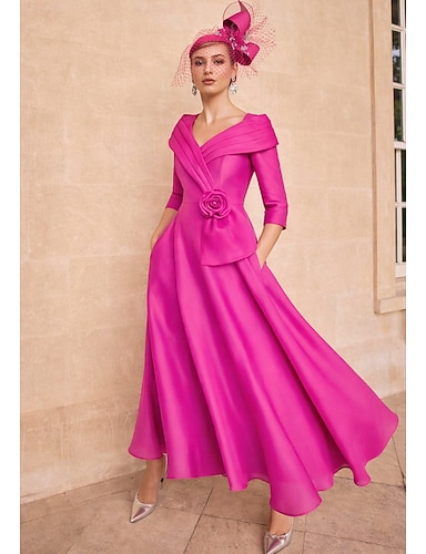 Linea ad A Lunghezza Tè Abiti da Cocktail Elegante Floreale Mezza Manica Scollo a V Festa in giardino Formale Tasca Raso con Stampa floreale Pieghe Arricciato
