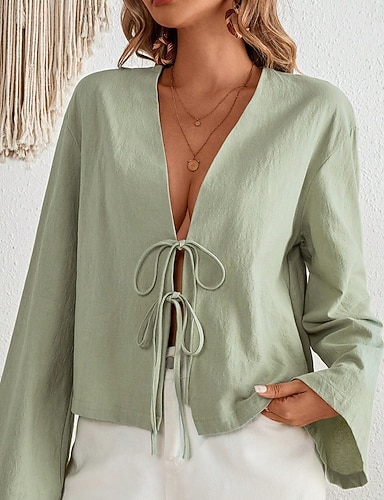 Per donna Camicia Estiva Camicia casual Blusa Arricciato Nodo frontale Tinta unica Semplice Elegante Classico Casual Manica Lunga Manica a Campana Scollo a V Top Regolari Quotidiano Ferie Uscire