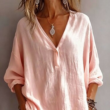 Per donna Camicia Camicie di cotone e lino Blusa Manica Lunga Scollo a V Tinta unica Dubbele Rij Knopen Moda Essenziale All'aperto Vacanza Blu Nero Rosa scuro Estate Vestibilità regolare