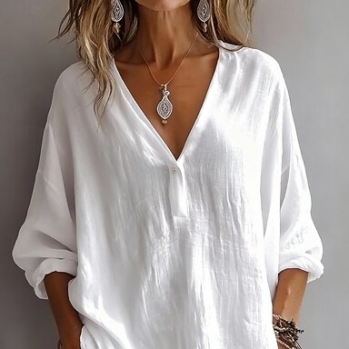 Per donna Camicie di cotone e lino Arricciato Tinta unica Quotidiano Essenziale Casual Manica Lunga Scollo a V Top Regolari Quotidiano Blu Bianco Rosa Verde Estate Primavera Autunno
