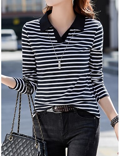 Per donna Polo Maglietta Stampato A righe Moda Manica Lunga Colletto a Camicia Top Regolari Quotidiano Weekend Blu Nero Rosso Autunno & Inverno