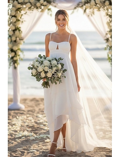 Linea ad A Asimmetrico Abito Bianco Piccolo vestito bianco Elegante Piccoli Abiti Bianchi Senza Maniche Spalline sottili Matrimonio Formale Chiffon con Volant
