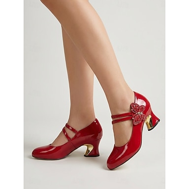 Scarpe Mary Jane da donna in similpelle verniciata rosso acceso - eleganti décolleté a blocco con punta arrotondata e farfalla, perfette per l'uso quotidiano, stile moderno vintage. &stile elegante da