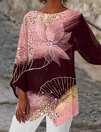 Per donna Maglietta Stampato Asimmetrico Floreale Moda Moderno Manica Lunga Girocollo Top Regolari Quotidiano Rosa Primavera Autunno