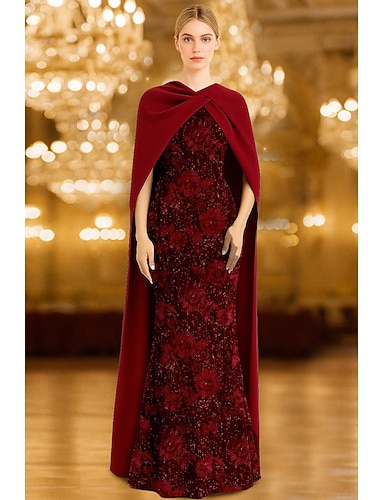 Tubino Colonna Lunghezza al pavimento Abito da ballo con mantello Abito da Sera Abito formale Elegante Monocolore Setoso Manica 3/4 Scollo a V Matrimonio Formale Mantelle Chiffon Raso con Fiore