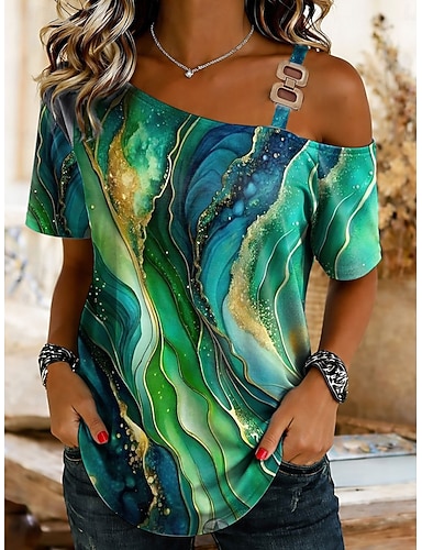 Per donna Maglietta Grafico Marmo Tropicale Hawaiano Casual Manica Corta Monospalla Collo asimmetrico Top lunghi Quotidiano Sportivo Uscire Blu Giallo Arancione Verde Estate Primavera