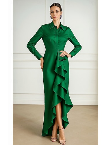 Tubino Colonna Asimmetrico Lunghezza al pavimento Abiti da Cocktail Abiti da festa Elegante Vintage Manica Lunga Colletto a Camicia Formale Ospite di nozze Raso con Volant
