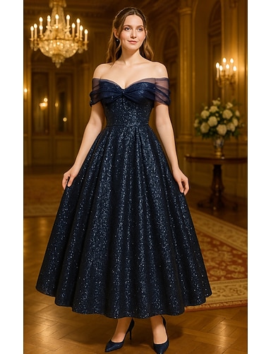 Linea ad A Lunghezza al pavimento Lunghezza Tè Abiti da Cocktail Abiti da festa Elegante Scintillante Manica Corta Senza Spalle Matrimonio Formale Tasca Con Paillettes con Glitter