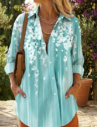 Per donna Camicia Blusa Bottoni Floreale Elegante Moderno Casual Manica Lunga Colletto a Camicia Top Regolari Quotidiano Ferie Uscire Blu Estate Primavera