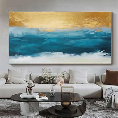 dipinto murale blu extra large su tela, dipinto tramonto sull'oceano, dipinto murale dorato, arte astratta blu, tela con texture, arte murale sulla spiaggia