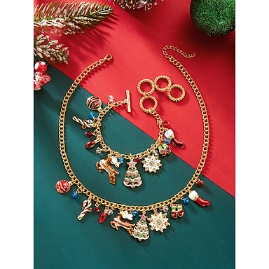 set di gioielli natalizi da donna, collana e bracciale color oro con ciondoli natalizi, accessorio festivo con albero e fiocco di neve &ciondoli a forma di bastoncino di zucchero come regalo &feste
