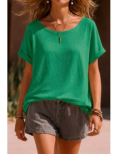 Per donna Maglietta Finto cotone e lino Tinta unica Vintage Moda Casual Manica Corta Girocollo Top Regolari Quotidiano Uscire Abbigliamento da vacanza Nero Verde Cachi Estate Primavera