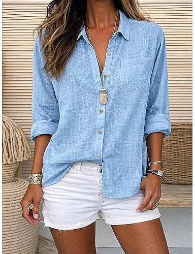 Per donna Blusa Camicia in finto lino Tasca Bottoni Tinta unica Elegante Casual Manica Lunga Colletto a Camicia Top Regolari Quotidiano Blu Estate Primavera Autunno