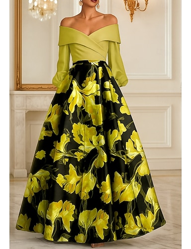 Linea ad A Lunghezza al pavimento Abito da ballo con mantello Abito da Sera Abito formale Elegante Vintage Floreale Manica Lunga Senza Spalle Matrimonio Formale Mantelle Raso Jacquard con Stampa
