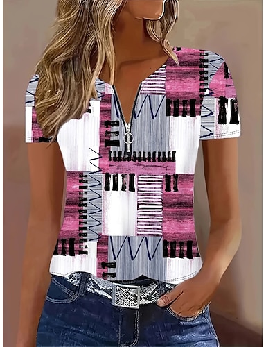Per donna Maglietta Cerniera Zip a un quarto Grafico Geometrico Astratto Tropicale Hawaiano Elegante Manica Corta Girocollo Scollo a V Top Regolari Quotidiano Sportivo Uscire Rosa Estate Primavera