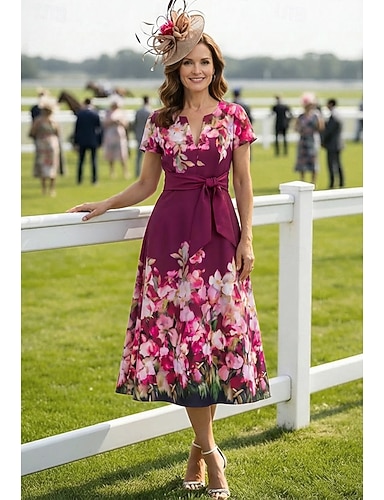 Linea ad A Lunghezza Tè Abito Formale Abito da cerimonia per signora Manica Corta Scollo a V Scollo Tondo Elegante Vintage Con Stola Formale Crepe Elasticizzato con Stampa floreale Fiocco/Fiocchi