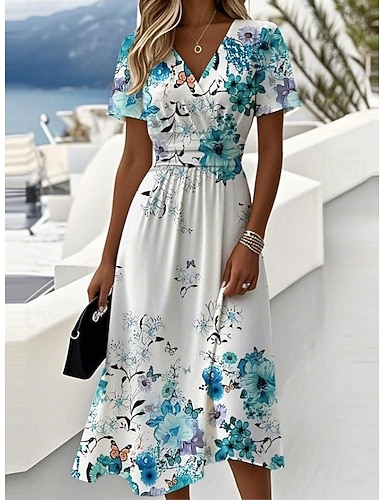 Abito da festa a lunghezza tè A-Line Abito da cocktail Abito per ospiti di matrimonio Abito per la madre della sposa Manica a 3/4 Collo a V Elegante Festa Formale Spandex Imitato Seta con Cristalli
