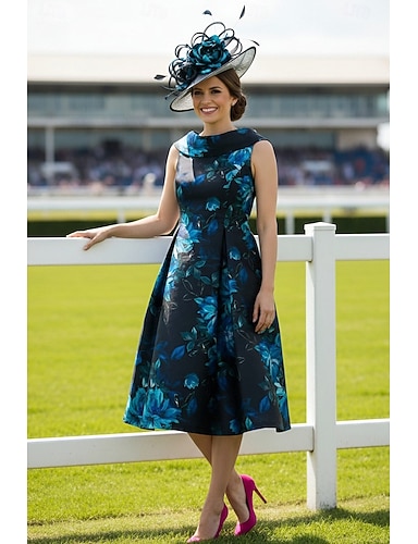 Linea ad A Lunghezza Tè Vestito da Festa Abito da Cocktail Abito da invitata a nozze Abiti da Ballo Elegante Senza Maniche Bavero Formale Ospite di nozze Raso con Stampa floreale