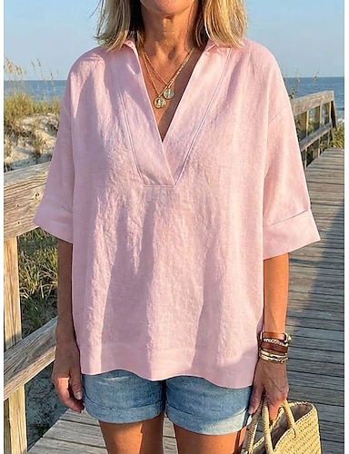 Per donna Camicie di cotone e lino Finto cotone e lino Tinta unica Essenziale Casual Manica 3/4 Scollo a V Top lunghi Quotidiano Nero Bianco Giallo Verde militare Blu marino Estate Primavera